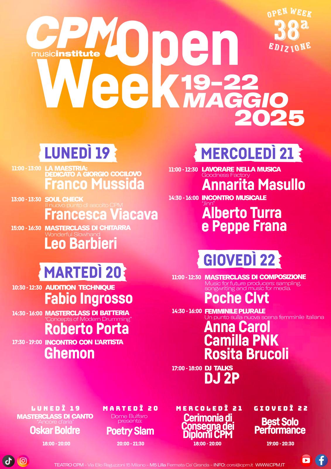 Ringraziamo tutti gli ospiti che hanno preso parte a questa edizione e tutti coloro che hanno partecipato, contribuendo con la propria presenza a rendere l’Open Week un’esperienza ricca di contenuti, confronto e ispirazione.